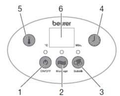 – Chức năng hẹn giờ: Bạn có thể cài thời gian sử dụng từ 20 đến 60 phút với chức năng hẹn giờ. Mỗi lần nhấn nút hẹn giờ (4), thời gian sẽ tăng thêm 10 phút. Hết thời gian cài đặt, máy sẽ tự động tắt. Thời gian sử dụng tối đa là 60 phút một lần. Sau đó tắt bồn, nghỉ ít nhất 15 phút trước khi sử dụng lại.