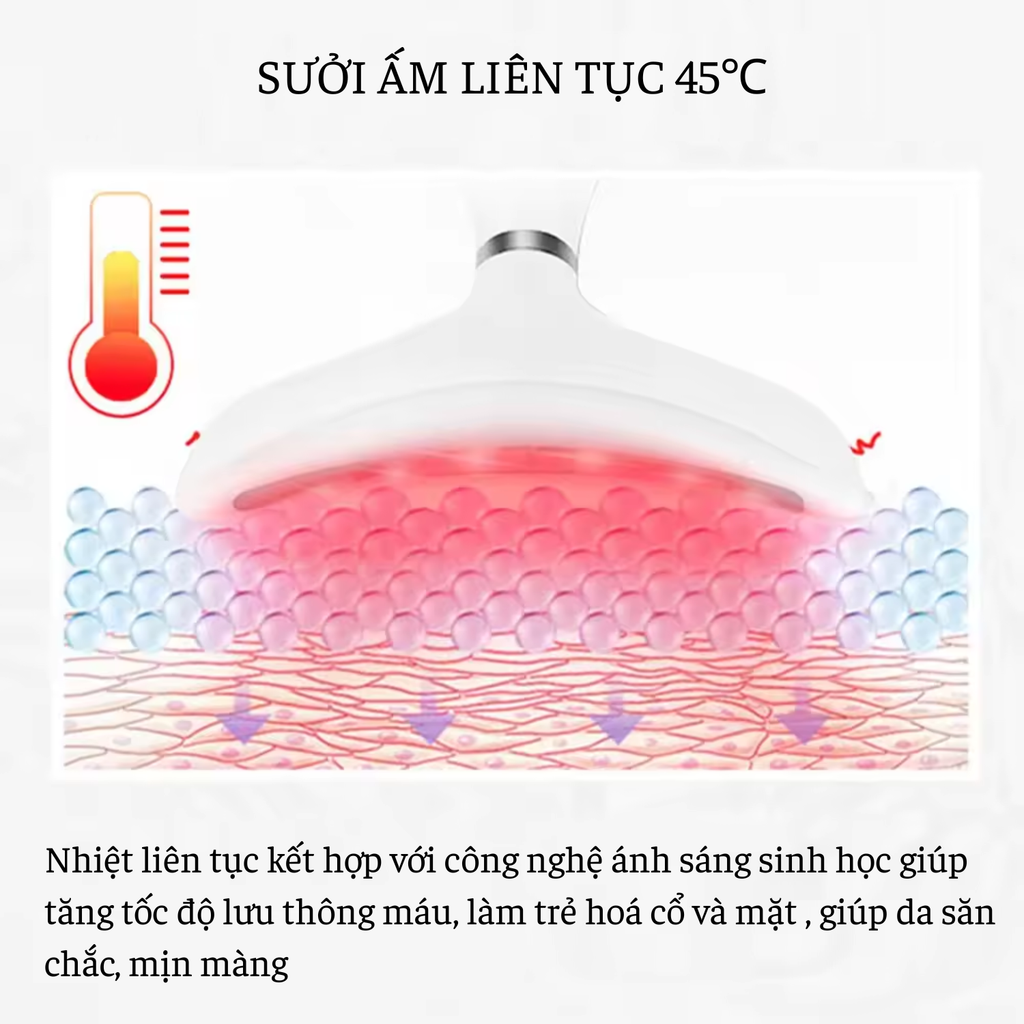 4. SƯỞI ẤM LIÊN TỤC 45℃: giúp làm mềm da và cơ, tăng tuần hoàn máu, từ đó hỗ trợ nâng cơ và giảm nhăn hiệu quả hơn. Nhiệt độ ổn định giúp dưỡng chất thẩm thấu sâu, đồng thời giảm mỏi cổ – vai – hàm sau ngày dài căng thẳng. Cảm giác ấm dễ chịu lan tỏa, mang đến sự thư giãn như trị liệu spa ngay tại nhà.