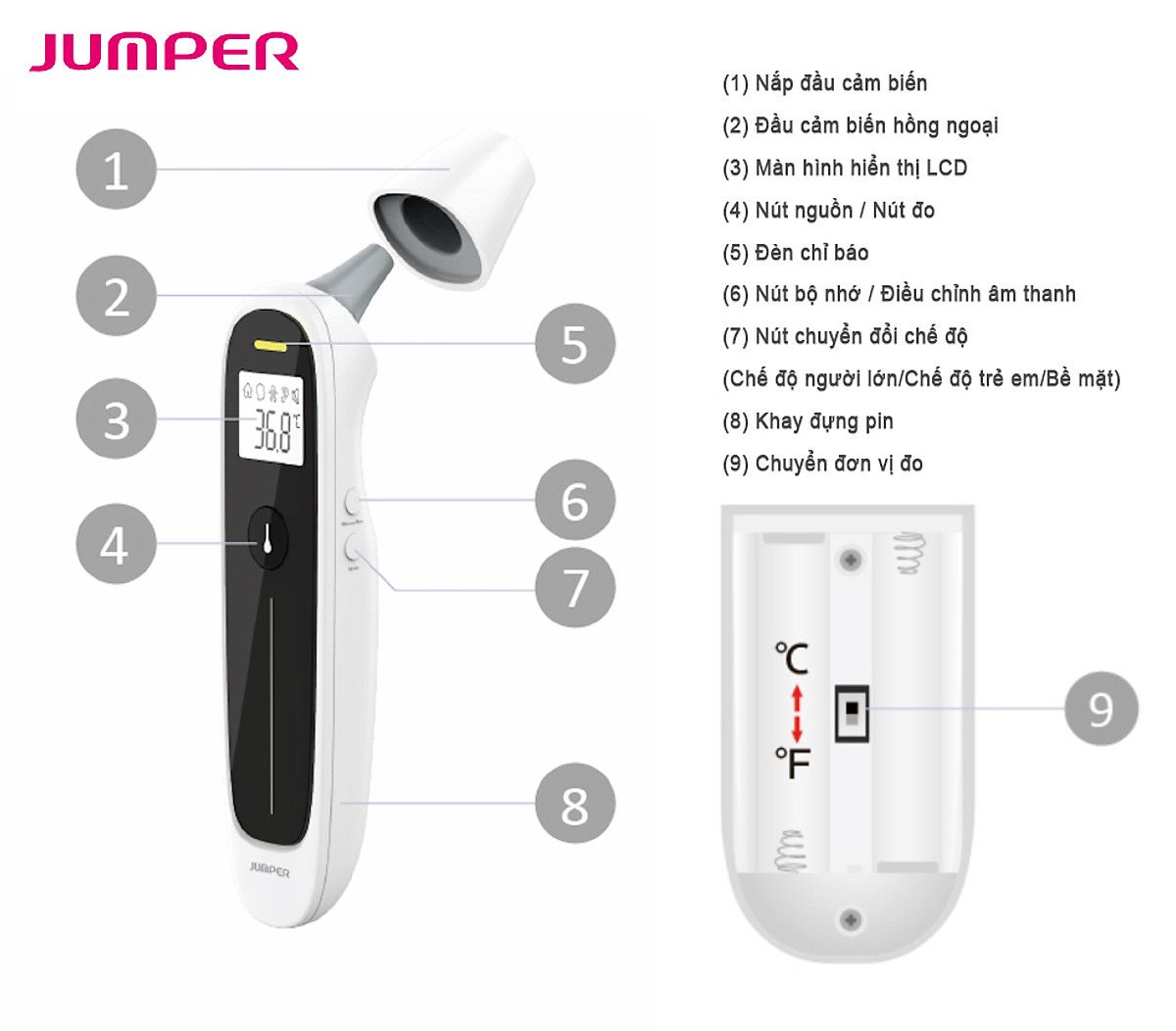 | Tên sản phẩm | Nhiệt kế điện tử hồng ngoại không tiếp xúc, đo trán và tai 4 in 1 Jumper JPD-FR302 |